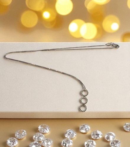 Questa catenina in oro bianco 18 carati presenta un elegante pendente formato da tre cerchi disposti uno sotto l’altro, in un delicato gioco di armonia e movimento. I cerchi, impreziositi da incantevoli diamanti, riflettono la luce con raffinatezza, donando luminosità ad ogni dettaglio. Il design lineare ed equilibrato esalta la purezza dell’oro bianco, rendendo questo gioiello moderno ma intramontabile. Perfetto da indossare nelle occasioni speciali o per arricchire con classe lo stile quotidiano. Un gioiello prezioso e versatile, capace di catturare ogni sguardo.